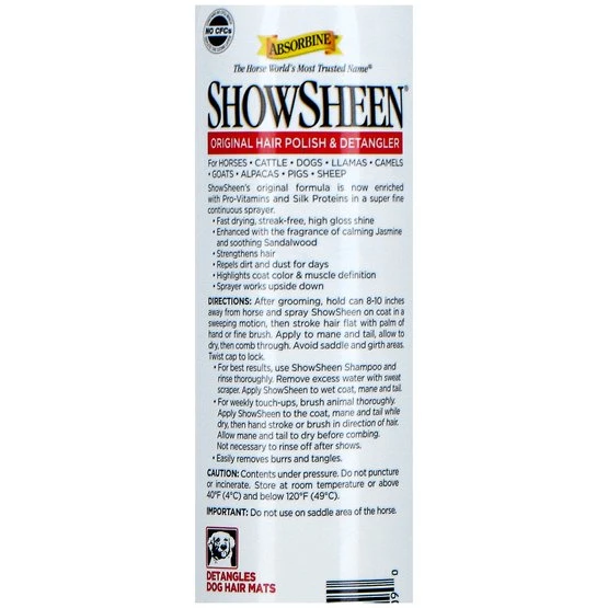 Showsheen Spray in einer einzigartigen Sprühflasche. Nicht irgendein Spray, sondern ein feiner kontinuierlicher Nebel für eine einheitliche und vollständige Abdeckung! Die ursprüngliche ShowSheen Formel ist nun mit Pro Vitamine und Seidenproteine angereichert für einen noch besseren Glans und Kraft. Showsheen stößt Staub und Schmutz ab und enthält den frischen Duft von Jasmin und Sandelholz.