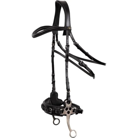Das E-Line Anatomic Genickstück (art.189058) ist anatomisch geformt und weich gepolstert. Der runde E-Schnitt bietet zusätzliche Freiheit hinter den Ohren des Pferdes. Der Hackamore enthält Anzüge und hat deshalb eine Hebelwirkung. Beim Anziehen der Zügel, wird es zum Drück auf der Nase und auf dem Kinn kommen und wird es ein bisschen Druck auf dem Nacken und den Ohren geben. Der extra weiche Padding beim Nasenriemen sorgt dafür das den Druck gelindert wird. Außerdem gibt es ein weiches Kinnpolster und Schutzlasche unter den Seiten des Stirnbandes.
