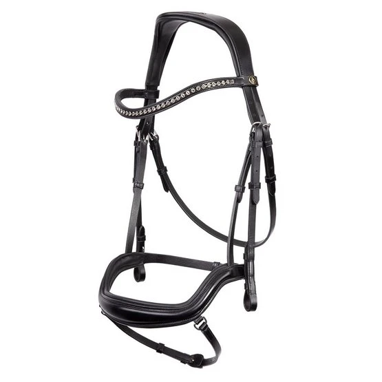 Der Trensenzaum ist aus Leder gefertigt, das sanft und beweglich ist und einen guten Schnitt ermöglicht. Das Leder ist hochwertig und bleibt lange schön. Das schicke BR Stirnband Vosges ist mit einer Kette aus edlen Stellux™ Kristallen in der Farbe Black-Diamond versehen und ist mit Leder unterlegt. Die Kristalle sind fest umklammert und stecken gut fest. Der Trensenzaum ist mit glänzenden, silberfarbenen Beschlägen aus verchromtem Messing ausgerüstet.