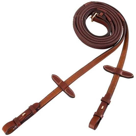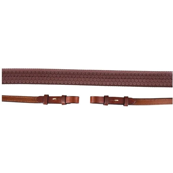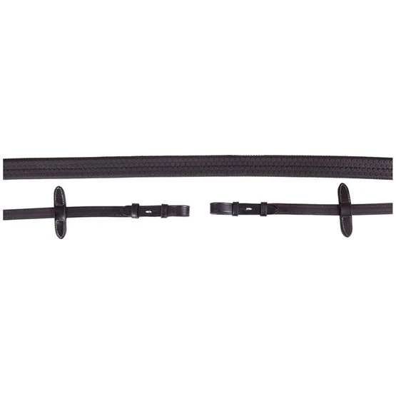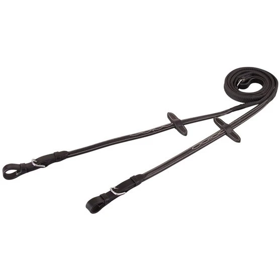 Griffiger Eventa Gummizügel mit Nylon Einlage, Martingalschieber, Zaumhaken und einer runden Schnalle. Zügel mit cremefarbigen Stickerei. 16 mm.