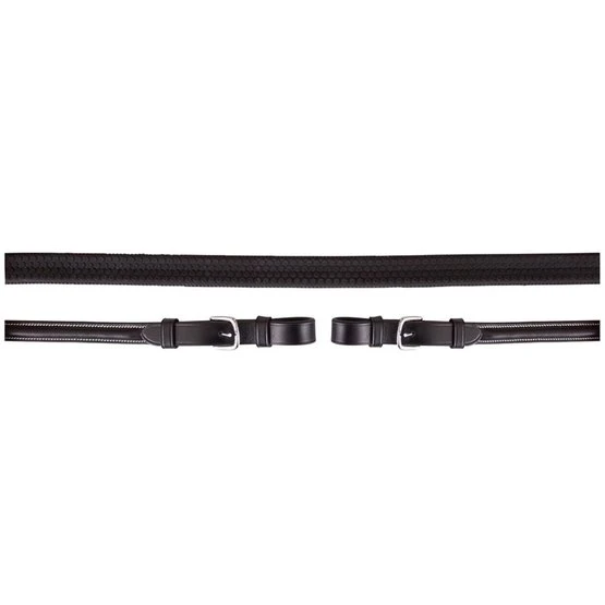 Griffiger Eventa Gummizügel mit Nylon Einlage, Martingalschieber und runden Schnallen. Zügel mit cremefarbigen Stickerei. 16 mm.