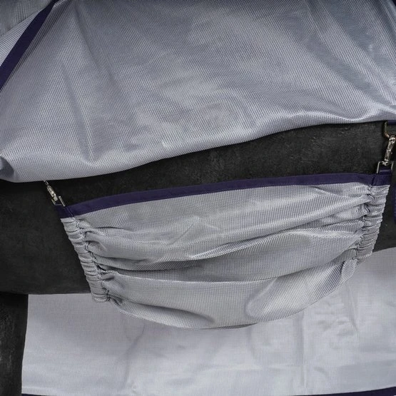 Durch die mit einem glatten Nylonfutter überzogenen Schulterfalten hat das Pferd viel Bewegungsfreiheit. Der T-Haken-Frontverschluss mit Magneten, die Beinbegurtung, der elastische Stirnriemen und drei Klettverschlüsse am festen Hals sorgen gemeinsam dafür, dass die Decke auf dem Pferderücken an Ort und Stelle bleibt.