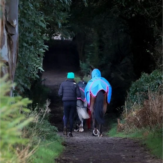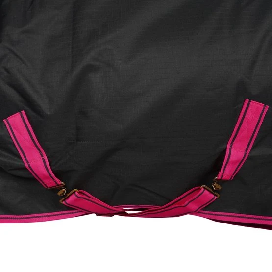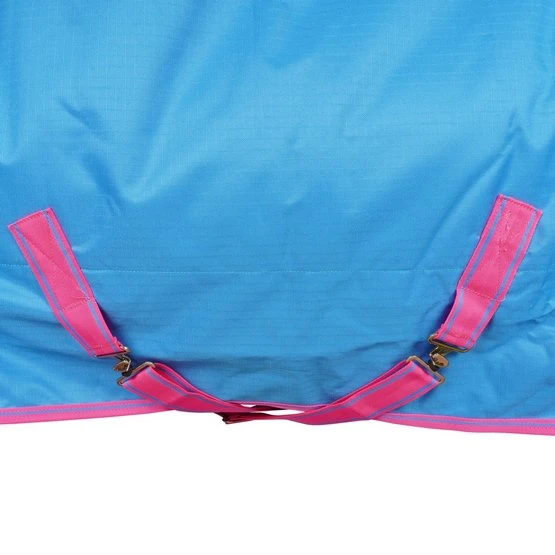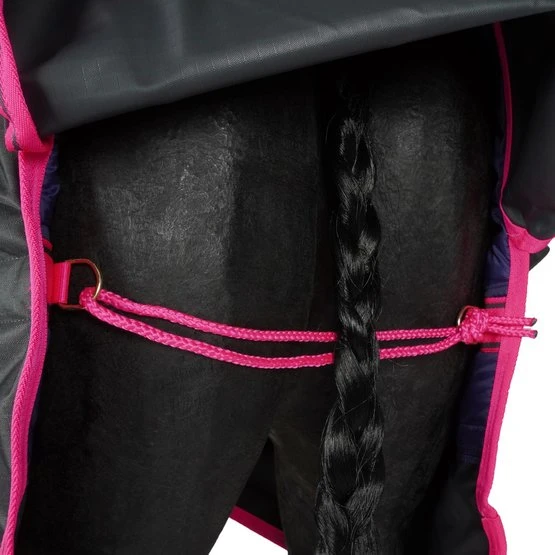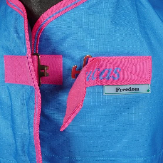 Der Freedom Turnout verfügt über ein 600-Denier-Ripstop-Außenmaterial und ist in mehreren Varianten erhältlich. Der Außenstoff besteht aus wasserdichtem und atmungsaktivem Polyester und die Innenseite aus atmungsaktivem Nylon. Die Decke hat einen sehr stabilen Frontverschluss (Click ’n Go) mit 2 Haken, die Sie verbinden müssen. Diesen können Sie dann durch die überlappende Lasche mit Klettverschluss verstecken und schützen. Mit den verstellbaren Kreuzgurten können Sie ihn ganz einfach an die richtige Größe Ihres Pferdes anpassen. Die Decke hat hinten einen Beingurt, dieser Beingurt reicht aus, um die Decke an der richtigen Stelle zu halten. Wenn Sie ein Paar Beingurte an der Decke haben, gibt es dafür Befestigungspunkte, diese sind jedoch nicht im Lieferumfang enthalten.