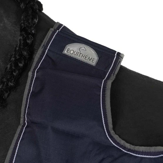 Hergestellt aus wasserdichtem und atmungsaktivem 600 Denier Ripstop Polyester auf der Oberseite. Der untere Teil ist wasserdicht. Sattelmulde und abgeschrägte Seiten für besseren Beinkontakt. Selbstsichernde Befestigung an Widerrist und Schweifriemen. Reflektierendes Logo.
