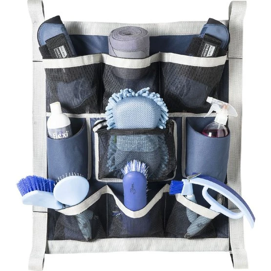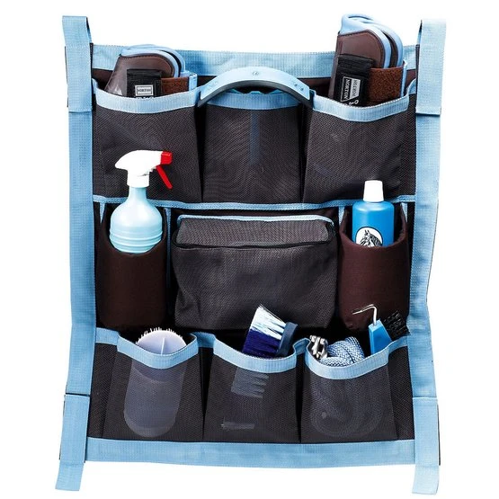 So haben Sie alle Pflegeprodukte immer griffbereit. Einfach mit Klettschlaufen an den Stäben der Scheunentür oder an jeder beliebigen Stelle an der Wand zu befestigen. Verstärkungen aus Nylon mit 6 großen Säcken aus Meshgewebe zum Aufbewahren von Bürsten, Bandagen oder anderem Zubehör, einer Tasche mit Reißverschluss und zwei vorgeformten, gepolsterten Taschen für Flaschen (wie Lotion, Shampoo).