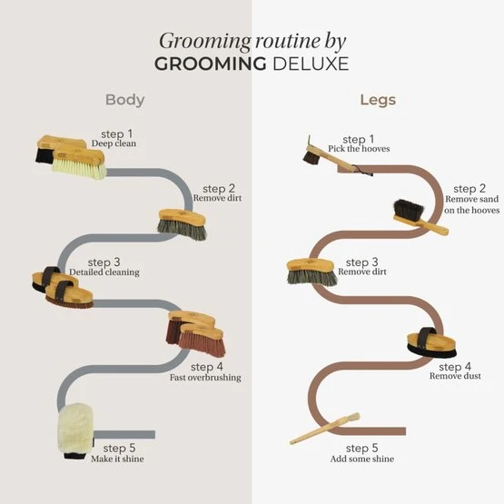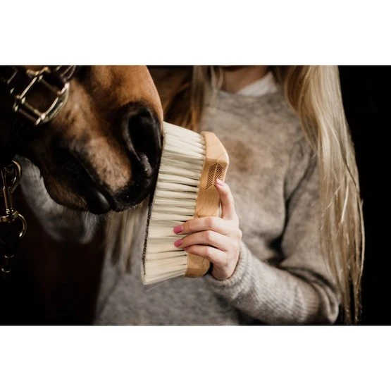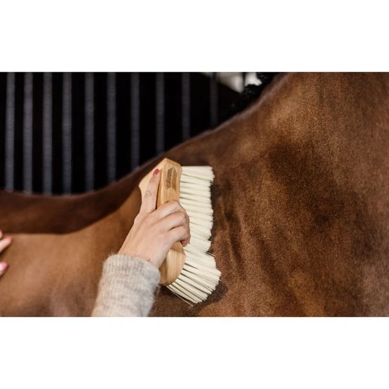 Diese lackierte Bürste hat lange cremefarbeneBorsten, um gelösten Schmutz und Haare zu entfernen. Die Borsten aus Polypropylen sind weich und eignen sich ideal für den Sommer, wenn das Fell dünner ist,oder bei geschorenen Pferden. Die Borsten in der Mitte sind glatter, um mit der Bürste einen besseren Effekt zu erreichen. Reinigen Sie Ihre Bürste, indem Sie sie in warmes Seifenwasser eintauchen und stellen Sie so sicher, dass sie lange hält. Mit dieser Bürste wird Ihr Pferd zum Star im Stall!