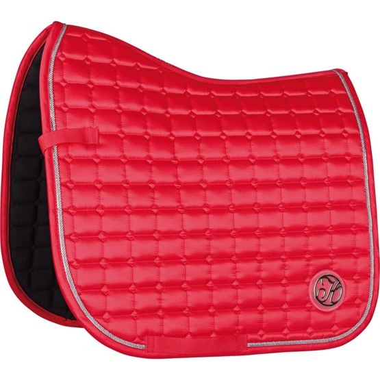 Schabracke aus luxuriösem Satinstoff. Ausgestattet mit einer Kordel und Metallpaspeln. Ausgestattet mit einer Gurtschlaufe und Klettverschluss an den Sattelschlaufen.