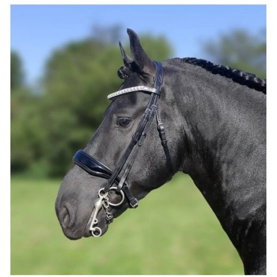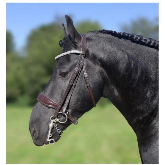 Diese Bar- und Trensenzaumzeug ist aus weichem Spezialleder gefertigt, mit Edelstahlbeschlägen mit Blindverschlüssen an Backenstücken und Zügeln. Das Kopfstück ist weich gefüttert und zurückgeschnitten. Mit anatomisch lackiertem Nasenriemen 4cm breit und weißem Glitzerstein-Stirnriemen.
