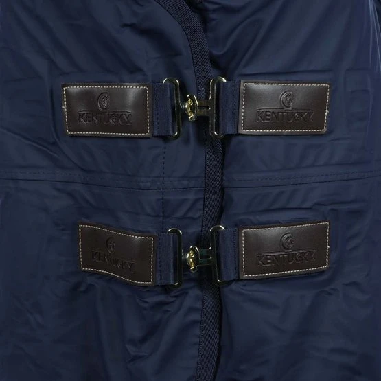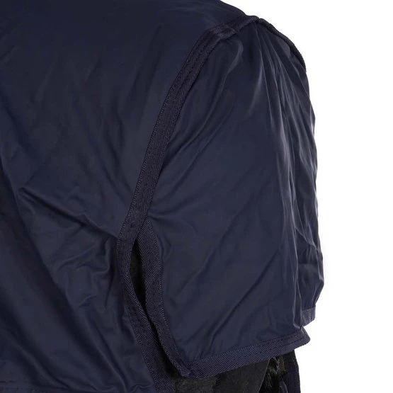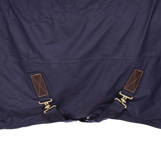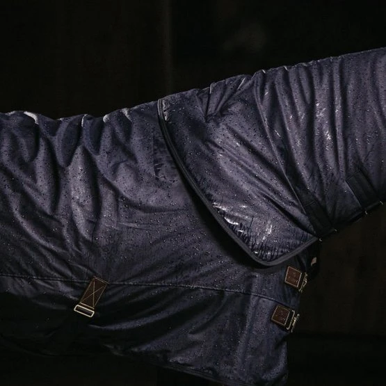 Für 100% Wind-und Wasserdichteverwendenwir das gleiche Material wie für den Regenmantelfür Pferde, eine PU-Beschichtung. Diese Beschichtung ist die gleiche, die auch für die typischen gelben Fischerjacken verwendet wird. Sie wird auf der Außenseite der Decke aufgebracht und ist daher auf dem Markt für Decken einmalig. Dank des künstlichenKaninchenfells auf der Innenseite ist die Decke sehr weich für die Haut und scheuert nicht. Das Futter sorgt auch für glänzendes Fell beim Pferd und verhindert das Gefühl von Feuchte unter der Decke. Die 50 g Faserfüllung schützt Ihr Pferd zusätzlich vor Kälte. Diese Füllung bildet zusammen mit demkünstlichen Kaninchenfelleine isolierende Schicht, die die Körperwärme des Pferdes einfängt und speichert. DieHurricane-Decke hatvorne zwei klassische Edelstahlverschlüsse in Messingoptik, zwei Kreuzgurteund eine abnehmbare Schweifkordelmit Kunststoffüberzug. Die klassischen Kunstlederpatches und die goldenen Details lassen Ihr Pferd auch an Regentagen elegant aussehen.