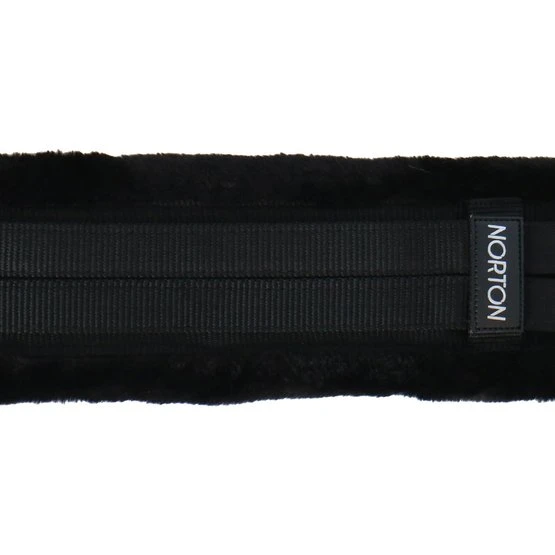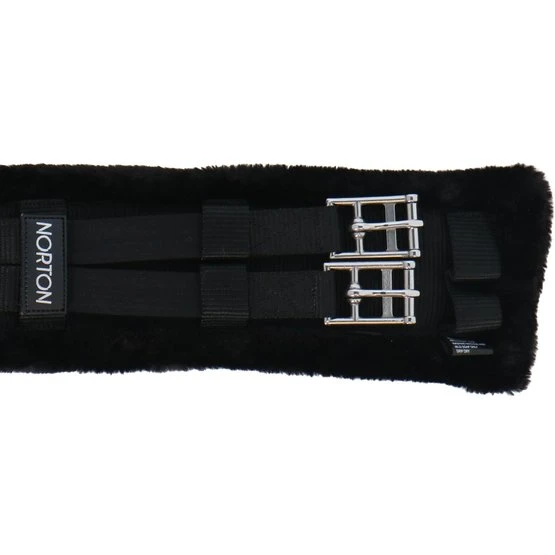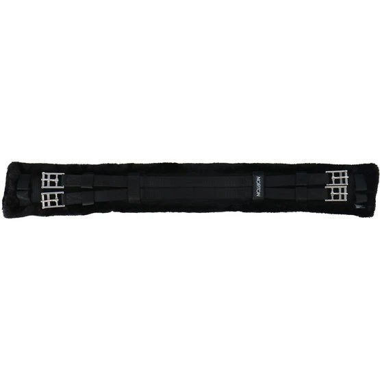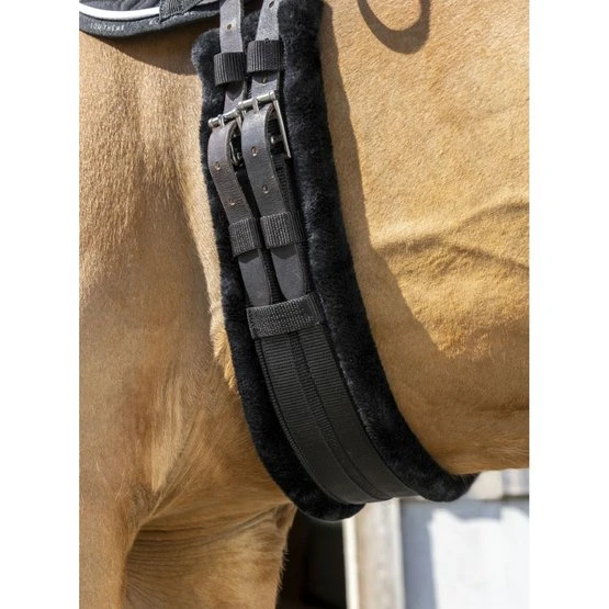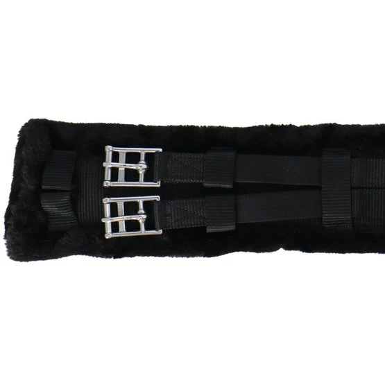 Gurt aus Polypropylen mit Synthetik-Schaffell gefüttert. Rollschnallen aus Edelstahl. Doppelte Gummibänder an einem Ende.