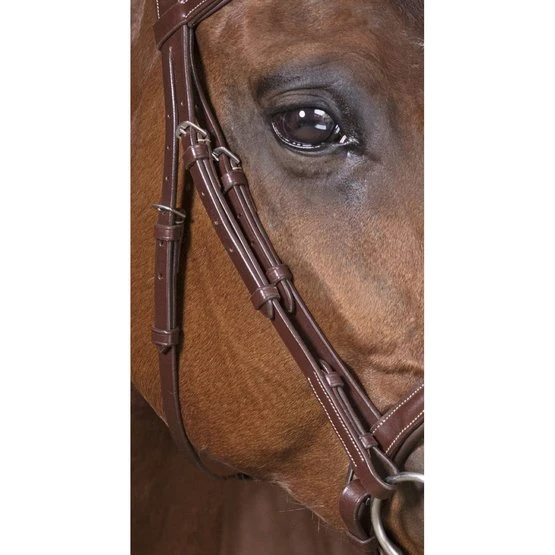 Büffelzaumzeug mit vorgeformtem Kopfschmuck, Stirnband und Blitznasenband, gefüttert mit Rindsleder, verdeckter Verschluss an den Backenstücken. Weiße Nähte. Edelstahlschnallen. Ohne Zügel verkauft.