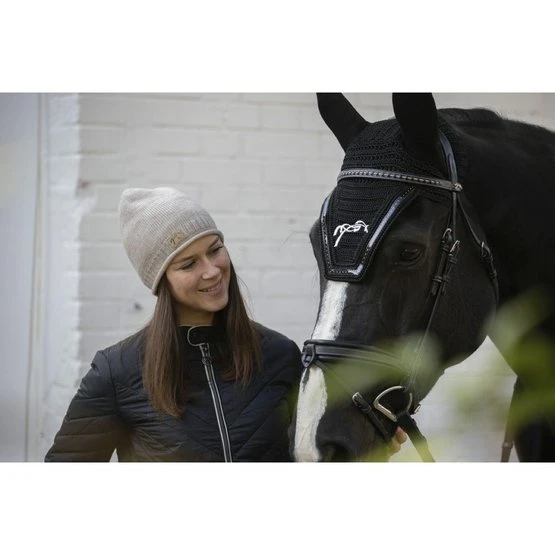 Fliegenhaube mit elastischen Ohren. Pénélope Logo passend zur Farbe der Point Sellier Einfassung. Weiter Schnitt hinter den Ohren für die Anpassung an anatomische Genickstücke. Karree Form vorne.