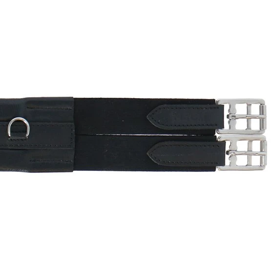 Anatomisch geformter Ledergurt mit Elastik-Einsatz an beiden Enden, sowie einem D-Ring für Hilfszügel in der Mitte. Die anatomische Form des Gurtes gibt dem Pferd maximale Bewegungsfreiheit. Die elastischen Einsätze bieten zusätzlichen Komfort und erleichtern das Nachgurten. Der Gurt hat einen extra D-Ring an beiden Enden für Hilfszügel. Mit Edelstahl-Rollenschnallen.