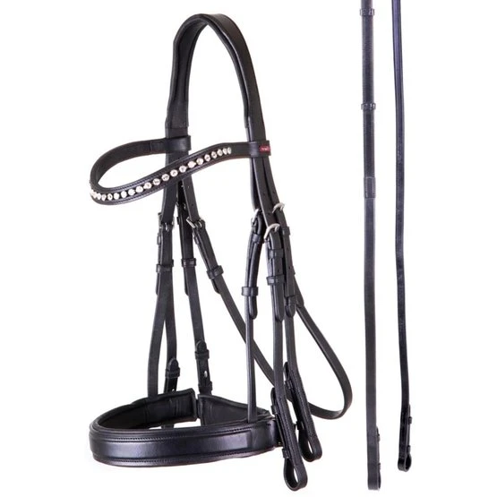 Symetrische Kandare mit anatomisch geformtem, weich unterlegtem Genickstück, das an den Ohren zurückgeschnitten ist. Das leicht geschwungene Stirnband hat eine 1-reihige, weiße XL Strasskette und ist weich unterlegt. Das breite (circa 4 cm) schwedische Reithalfter ist bombiert und hat eine weiche Kinnunterlage. Die Backenstücke haben Zaumhaken, die Kandare Edelsthalbeschläge. Dazu gehören Leder-Dressurzügel (16 mm) mit Gummierung, Lederstegen und Zaumhaken, und glatte Leder-Kandarenzügel (13 mm) mit Zaumhaken.