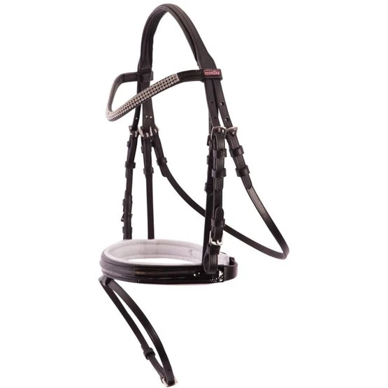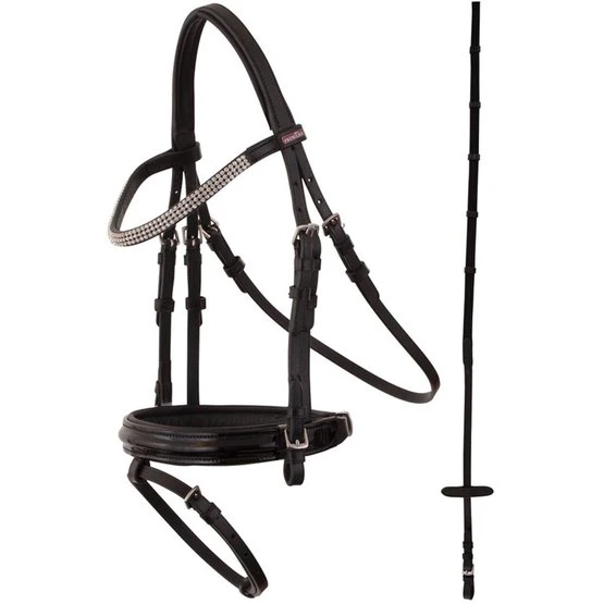 Symmetrische Trense mit anatomisch geformtem, weich unterlegtem Genickstück, das an den Ohren zurückgeschnitten ist für zusätzliche Freiheit. Das leicht geschwungene Stirnband hat eine 3-reihige, silberfarbige Strasskette und ist weich unterlegt. Das englisch kombinierte Reithalfter aus Lackleder ist rund bombiert und weich gepolstert. Die Trense hat Edelstahlbeschläge. Der mitgelieferte Gurtzügel hat Lederstege und Martingalschieber.