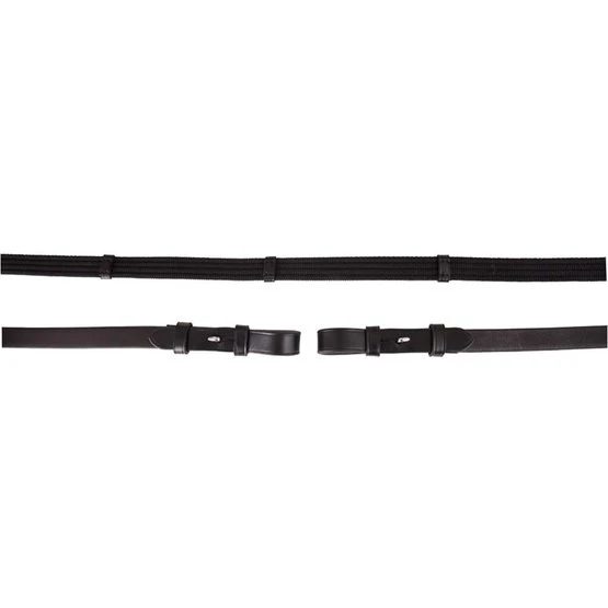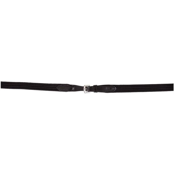 Gurtzügel (19 mm breit) mit Lederstegen und Martingalschiebern. Die Lederenden haben Edelstahl-Zaumhaken und sind 16 mm breit.