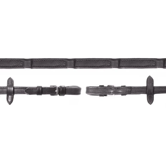 DURASOFT REINS: Diese innovativen, neuen Zügel besitzen einen reißfesten Kern aus Nylon. Bis zur Gebissschlaufe ist ein reißfestes Gurtband eingelegt, bei dem das Kerngewebe vergleichbar ist mit dem Material von einem Sicherheitsgurt. Das verarbeitete Leder ist strapazierfähig aber auch extra-soft und geschmeidig. Eingearbeitete Stege sorgen für eine sicherere Lage in der Reiterhand. Der Zügel hat Martingalstopper und ist 16 mm breit.