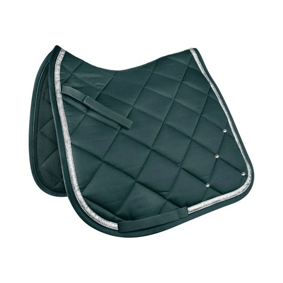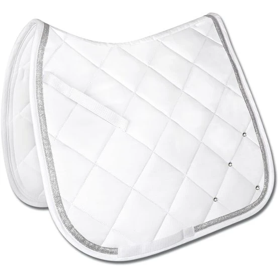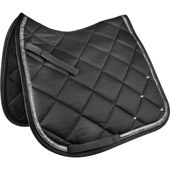 Elegante, hochwertige Schabracke mit Glitzerband. Die zusätzlichen Glitzersteine machen diese Schabracke zu einem echten Hingucker. Die funktionelle Unterseite sorgt für eine optimale Atmungsaktivität. 8 mm Schaum und 250 g/m² Watte gewährleisten beste Druckverteilung.