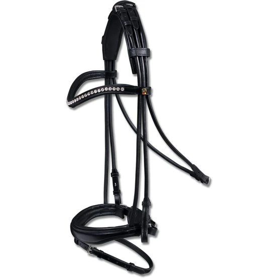– Schwedisch kombiniertes Reithalfter- Rund genähtes Reithalfter, Backenstücke und Kehlriemen- Separates, weiches Polster im Genick- Geschwungenes Stirnband mit glänzenden Kristallen- Nasenriemen und Genickstück weich gepolstert – Backenstücke und Zügel mit Haken- Edelstahlbeschläge- 19 mm Gurtzügel
